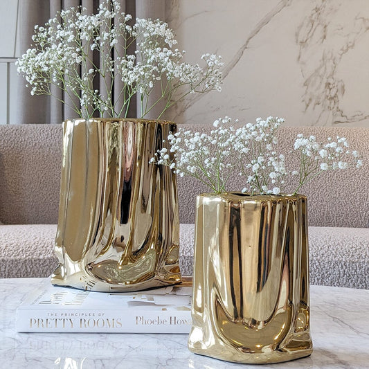 Vega Paper Bag Style Gold Ceramic Vases - Set of 2